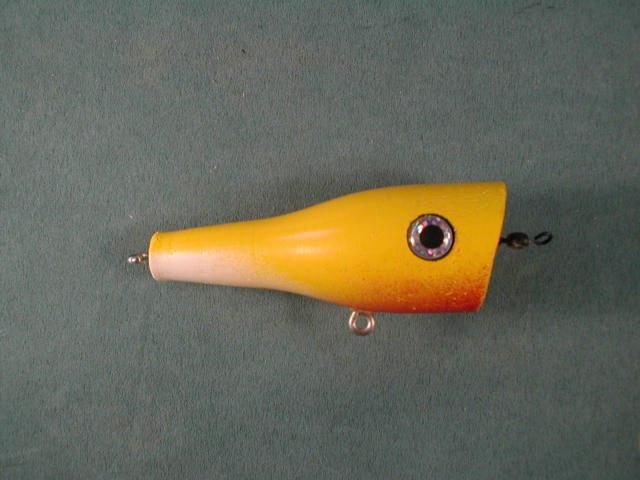 Here's another from the last batch. Had to try something like this after reading about those cutty poppers and Bassmaster's commentsd about little plugs in the wash. Made out of maple, about 2 1/2" long. Just over an ounce with hooks.