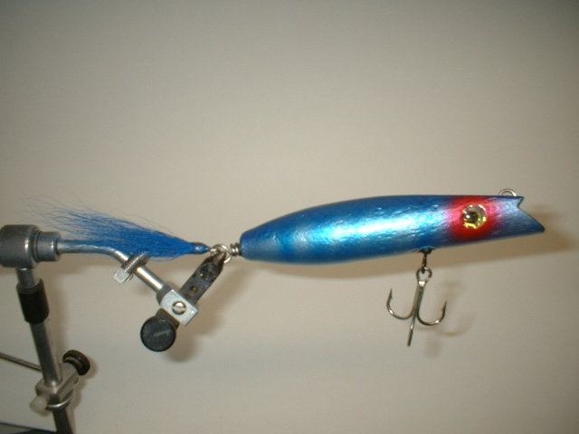 Heres two more I just finished. Both about 1.5oz. Both have tails tied on screw eyes so no hook in the rear. Wish I could get the colors to come out better on this one. Its dark blue back with pearl silver scaling fogged in over pearl blue stripes. Shiner is pearl red.