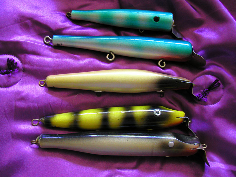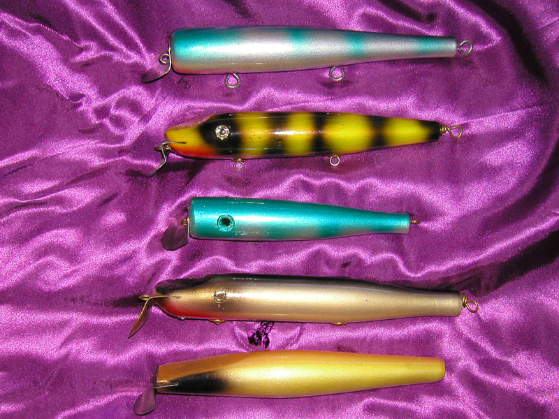 Plus this group of plugs w were obvidously never used by someone that could catch fish. ( Bought on e-bay) They hadd few marks in the wood and the paint had either been painted over  or peeled off from not loving them.