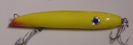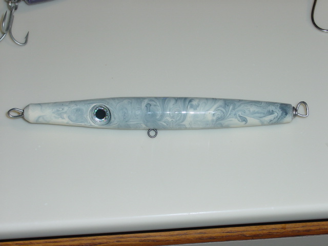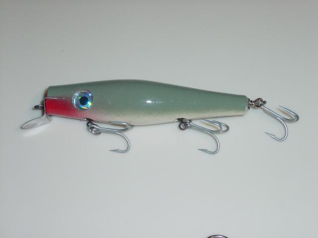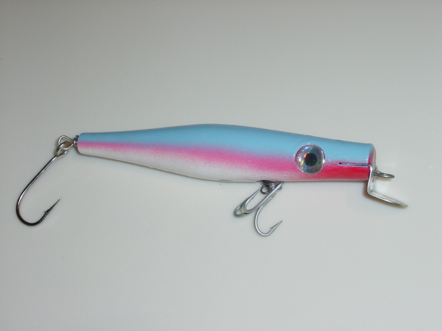 For instance, I made a single hooked danny and moved the belly hook up in the front of the plug. The weight of the hook makes it sit nose down so it swims about 5 or 6 feet under on a fast retrieve. If i cut a slope on the head it will swim deeper..I've found that 2 hook jobs like that first one are best if you want it to stay on the surface because it balances the plug.. Also the more wood you have in the plug, the more your plug will stay on top(bouyancy). I gleaned that from Bassmaster. I couldnt understand why he made such fat dannies.. then I made a skinny one and found out