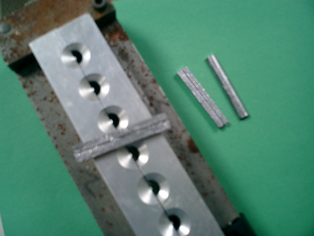 I made a mold for the tail weights. The picture is not too clear, crappy camera. I make them in halfs and about 3 inches long so you can cut them to desired lenghts. They are .375 3/8 dia. You just drill the hole and insert the two halfs. It has a thru hole that will accept the .062 welding wire. It works great. I have not yet built a plug but made the mold for that reason a few years back. I am willing to let anyone use the mold if they like. Pour a few hundred and your all set for a few years. I have already poured about 200 halfs. I will bring it to the plugmaking party along with a few others. I would like to maybe make a few more sizes and maybe one for belly weights. I am open to any ideas. Like I said anyone can borrow it if they like. P.M.