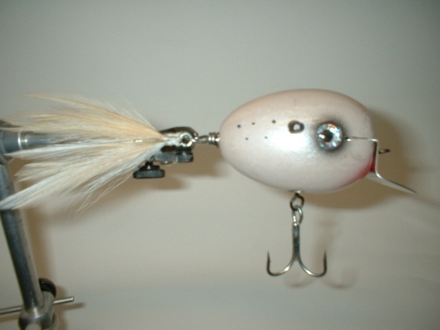 Heres a little egg I put the finishing touches on last night. Egg is from the craft store, lip is a pikie2. Paints were pearl white shot over white basecoat, flat black for the shiner and dots, theres a small touch of red on the chin. I added a little bronze pearlex to the top, just a touch and the sides have some very fine glitter. Floated it in my fishtank and it floats with the eyes just below the surface. Tail is tied with light ginger rooster hackles over blue dun rooster hackles whit a sparse colar of white bucktail.