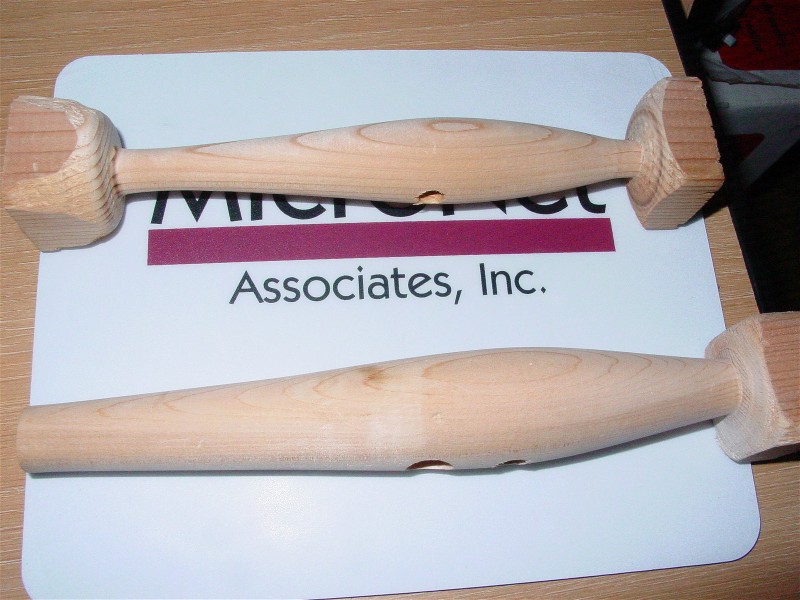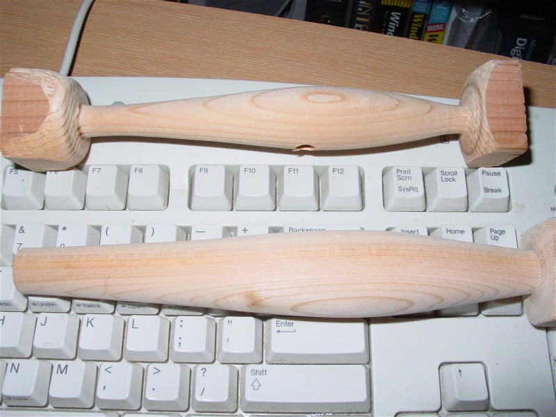 Larry I like that plug you gave me so I tried to make a few. For the first ones I thought they came out alright. I have to sand down the ends a little more. And fiqure out the weighting. One is 9 inches the other 6. TO thanks for the help.