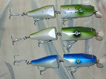 A few new ones. Jointed pikies (2.8 oz) and some striper sized hand carves (1 3/4 oz). The latter run around 2 foot deep with a nice wobble  Pikies snake on the surface