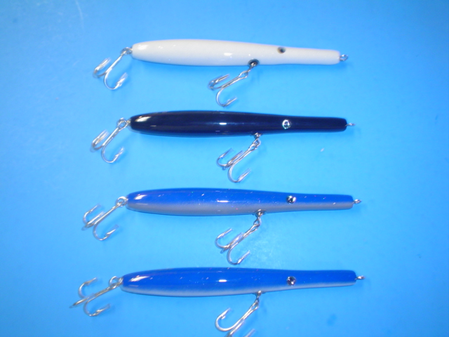just released- AH needles, 8" 2-1/4 oz. these cast like a bullet AND wiggle real sweet! just dropped off a bunch to peteg at the saltwater edge. he has white, blue over silver, blue over white, and black. black over purple and olive over gold coming soon. limited quanities.