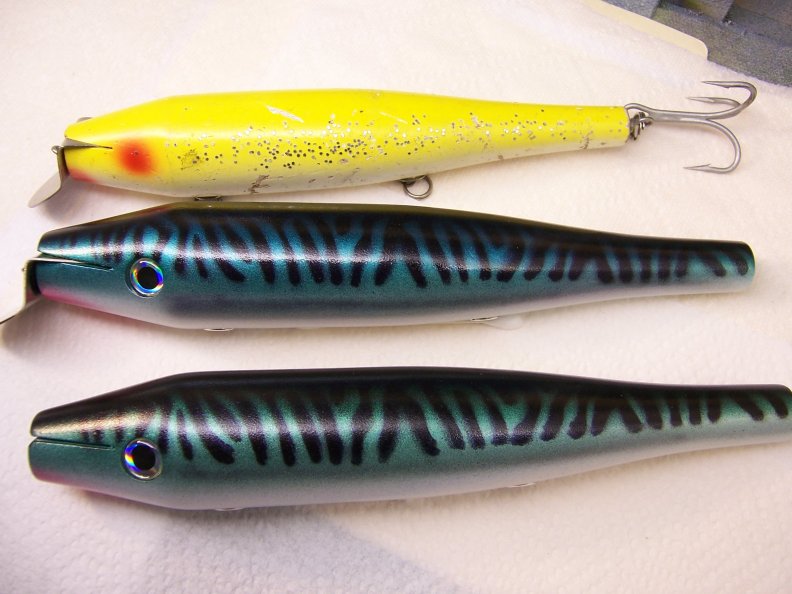 A pair of trolling plugs. These are actually my first turned wood about a year ago. I made the mistake of forgetting about them in the sealer for 24 plus hours.  The wood is 30 year old sugar pine so they sucked up the sealer and it took a good 6 months for them to finally dry. I had to fabricate the lips. I used the Gibbs trolling plug as my shape. I just went bigger. Still need to wire them up. Any recommendations on the hook size. Another problem I am encountering is I need longer swivels because of the larger dia. of the plug. Thanks . Paul