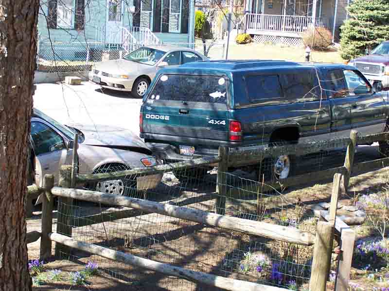 After he was gone the lady across the street came out and said she heard it and looked out the window. She told me when he hit the truck his car stalled. He tried starting it again as if to try and leave. She wrote down the plate # and then the police arrived.
