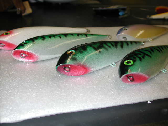 The plug is pine and heavily weighted. It is "hand" shaped with a bandsaw and spokeshave. The front bevel is cut on the bandsaw (as the side profile is cut from a square block) and slightly hollowed. Originally I used a #3 and #7 gouge, which is precise but tedious (particularly in some maple ones) but recently I've used a Salty ball in the drill press and passed the plug on its side past it. Works pretty well. The plug is through wired, but the belly hanger is a sinker eye epoxied in (due to weight placement issues). I've used screw eyes in the maple ones. They swim with a slow wag, subsurface, like a needlefish only more pronounced, but as you speed them up the better ones hump the surface and dart/glide a bit. I haven't tested one in current yet. They look very promising for night fishing, but no fish has looked at them yet so who's to say. Still alot to learn about them.