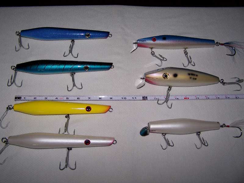 Here are a few large plugs. Pencils are 4 ozs, white danny is 3 oz. The Copy of a pichney troller is 3 1/2 ozs and swims really deep. Hope to entice a few large with it in a few weeks at the Canal. The bunker swimmer is a copy of a Fixter bevelhead on steroids (thanks Mike) and weighs 4 3/4 ozs.