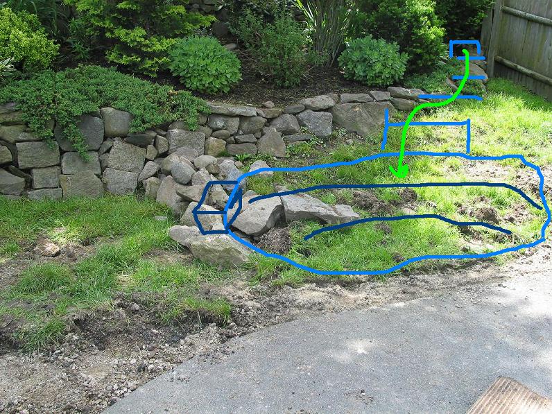 Question. I'm planning on rebuilding the stone wall...but what extra care should I take in placing the pond so close to the wall? Difficult to see in the photo, but the wall just turns into a row of stones on the surface as the slope of the small hill forms.