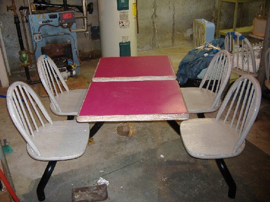 I have two of these split-top tables that once lived in a Dunkin' Donuts shop. They each have 4 swivel-seats. Have them listed on Craigslist for $100 each but will take less from S-B brothers. Would also be willing to trade for fishing-related items.