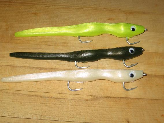 Ive got some pearl, olive, and pearl/chartruse available...(surfcasting-RI and Saltwater edge have black) Eels are scented with bunker oil, have a 90 lb wire leader harness with 7/0 VMC livebait hooks, and rattling eyes..