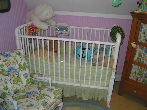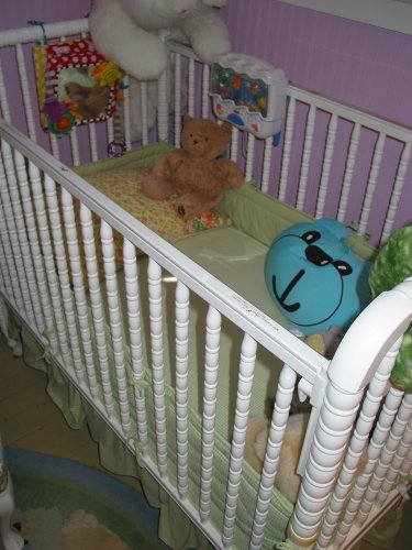 Jenny Lind style crib w/deluxe Simmons Super Maxipedic Plus mattress. Includes the green Pottery Barn bumper and skirt set.
