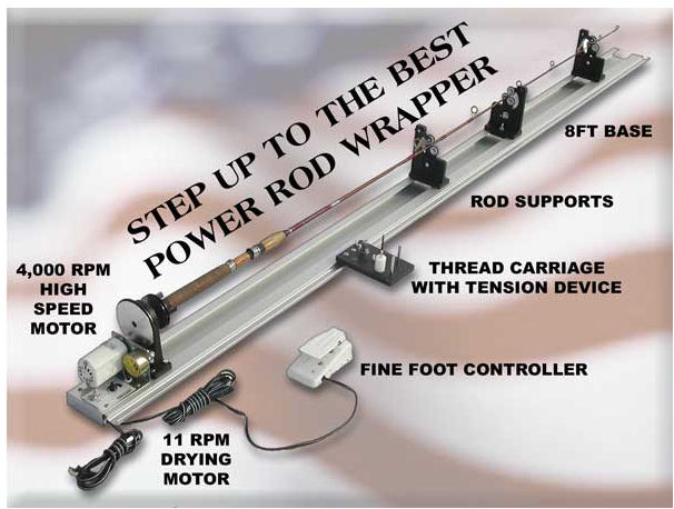 (Truly for the serious rod builder. Self centering chuck, multi spool thread carriage with tension device, ceramic line guide blade, 3 fully adjustable rod stands with ball bearing wheels, foot and dial controlled wrapping motor (can also turn cork grips), 45" indications on flywheel for diamond wraps, sectional 8' anodized aluminum base, 4000 rpm wrap motor, 11 RPM finish/dry motor.)