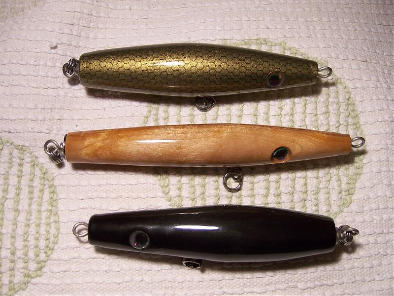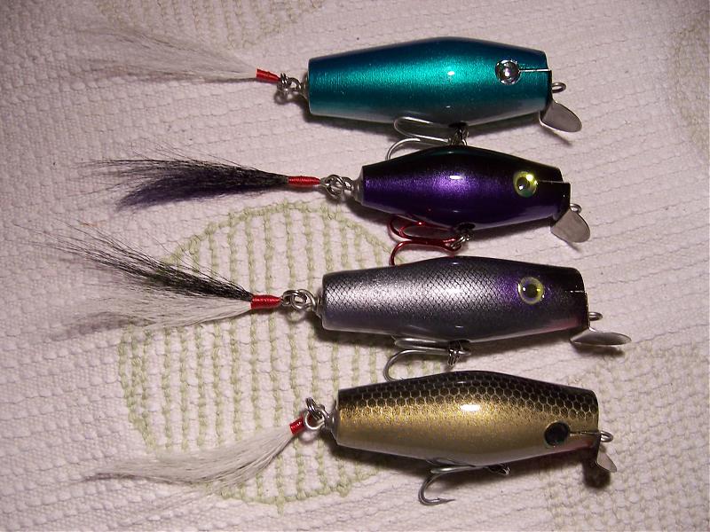 These are going to a show in Minnesota. The big one is 8 1/2" of wood with a couple of chopper props on the end. The nose is cupped out. Throws a good splash up front and churns like crazy from the a$$ end. Sits tails down, sharp twiches with the rod tip can make it slash left then right.
