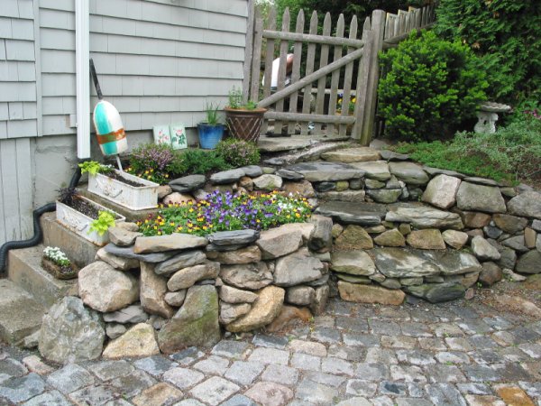 The intent was to make the stone work look like it's been there a very long time, while keeping the blacktop slab that was already there for the patio. The cobbles are all from Newport and are quite old and quite irregular. Everything from excavation to tamping was done by hand
