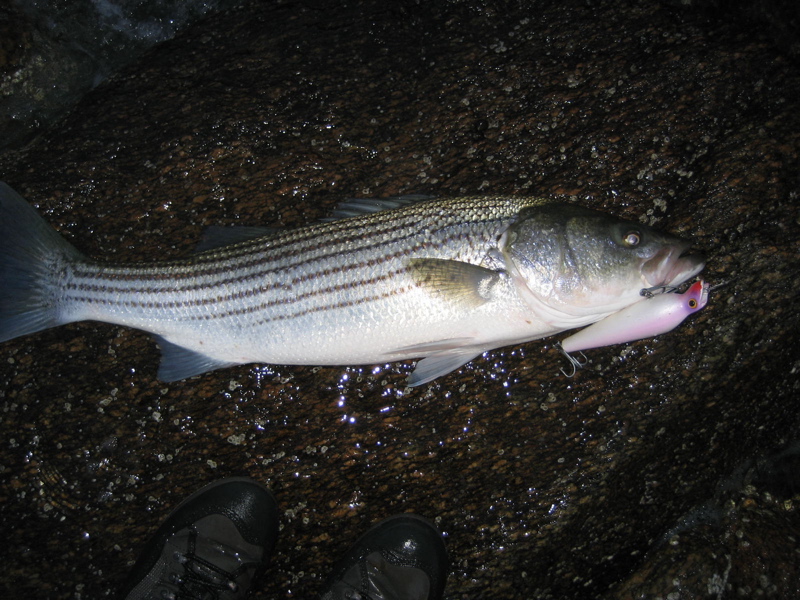 I like 'em, Eddy, because they are so versatile. You can pull them down two or three or four times to get them as deep as you want, then keep it there with a steady retrieve (brief pauses and twitches help too), or you can slow your retrieve and let them swim back to the surface. You can give them a short tug and move them along just subsurface. Their other advantage over a Danny is that they work better in rough water. Their head stays down and you can pull them through a wave. They are also more stable with a faster retrieve, though you can't work them on top as slowly as a Danny. The fish I've posted so far are only half the weight of the one I dropped, but I'm hopeful I can fix that in a week or so.