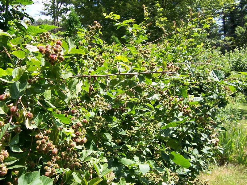 The black raspberries are in full swing now, I don't bother covering them as the birds need to eat too and it keeps them from the blu berries. 2nd photo is of my thornless blackberries which have a few weeks to go but look to be loaded and well over 10' high. They are a very soft and sweet fruit but don't ship well so if you buy them at the store they are usually not allowed to ripen fully because they need to be firm to ship or result in squashed fruit so they are never as sweet as ones that are left on plant till last possible second. These rarely make it to the fridge as we eat them as we pick em.