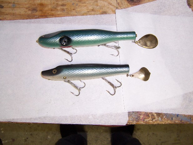 in this picture is my copy of the heddon flap tail, also a copy of a Charles Russo flap tail that I made at the same time, the Chas russo as made in a simular manner, but was a much simpeler plug to make...