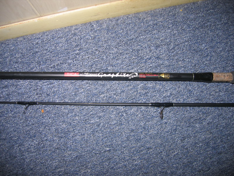 Tica Graphite Surf Spinning Rod 2pc Rod 9' UEHA The rod is listed as medium fast , 4 -6 oz, line 10-25 Medium Flat Graphite Blank Black, Cork Tape Grips, Fast Action. The third ring guide needs replacement but overall it's still in excellent condition. $45 shipped I only Paypal as payment.