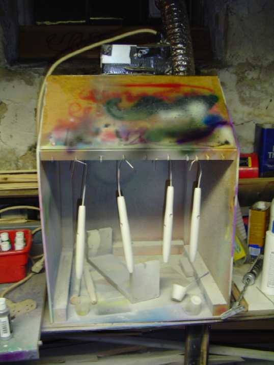A photo of Shopsmith #2, used for drilling. And my homemade spraybooth (wood box, bathroom fan, and a dryer vent)