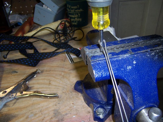 Now make a small loop, I use a #0 phillips in the vise and form the loop around it, by doing this, you relie on the wires memory to help form the loop ( it took me a lot of misery to gure that one out) trim the tag end so it leaves approx 1" of extra wire just like the nose loop.