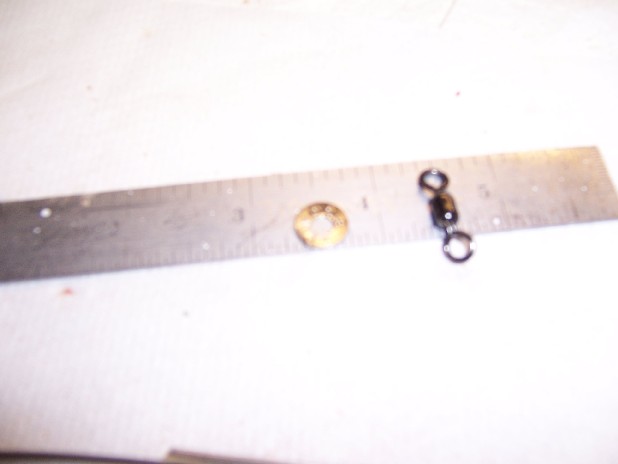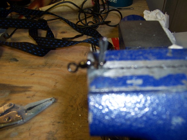 Now you want to close the loop, being certain that the 3/8 mark is on center of the loop, close it jist enough to allow a #1/0 swivel to go through, it takes practice to learn just how much to close the loop...