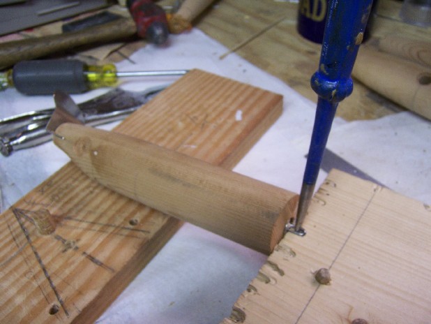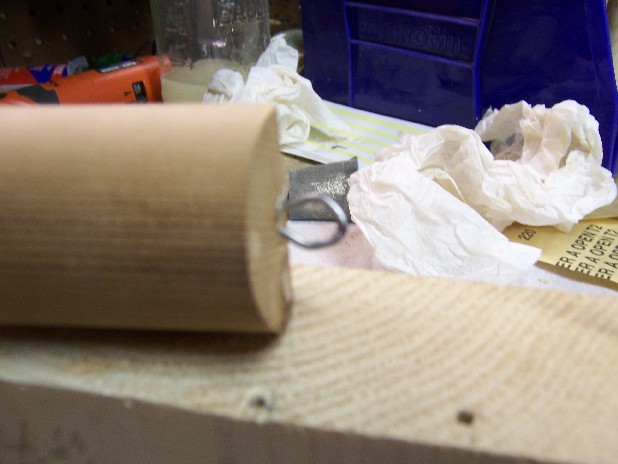 Now turn the block to the drilled side, insret the awl into the wire and tap it until the loop is spread and the lip is tight... if the loop remains a littl pointy at the tip, place the wire/plug on the awl and clamp it in the vise, a few gentle taps on the end of the wire wil round it out nicely.. reform the wire with the awl and block of wood one last tine to be sure the joint is tight..