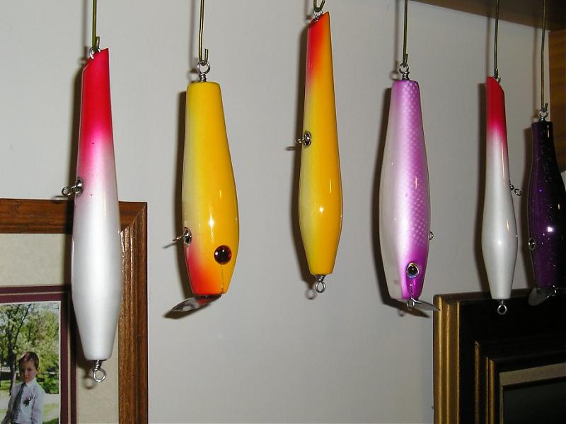 I've been that route, Now with the threaded rod I no longer have to deal with springs that stretch,sag and unwind or are not the proper length to keep the epoxy uniformly on the plug.... I have 6" of adjustment, can spin even odd shaped plugs like hand carved bunker /rattle traps and darters with narry a problem, the etex is pre heated in the box, it then pours like milk... mix thouroughly until it is gassing freely, the whole time I'm mixing ,the plugs have been in the spinner warming up, I can apply a paper thin coat of e-tex( most problems from e-tex use stem from to thick of a coating on the plug) with a 3/8"acid brush as the plugs spin, with lights at the top and bottom there are no shadows thus virtualy eliminating dry spots, once I've epoxied all six plugs, I go back and wipe any excess epoxy off of the tail and lips/heads with an acid brush and check for dry spots, I never even exhale or torch the plugs, I close the doors and set the timer for 3 hours and go work on something else, or got to bed...Handeling of the plugs is at a minimum so chances for contamination are nil....