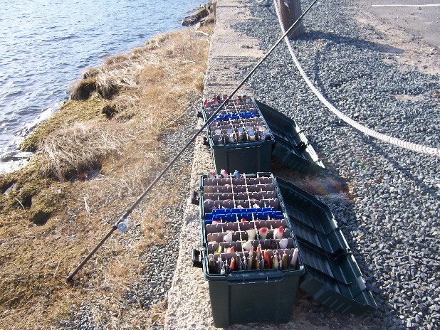 a week ago I took advantage of one of the warmer days and loaded two boxes of plugs, 135 in all and headed to the salt, It took 5 hours, a six pack of beer, help of a friend and ALOT of casts, but I got through it all., I'm happy with their action and they have been tuned to the salt,. these soldiers of the winter hopefully will earn their place amongst the seasond warriors of the summer....