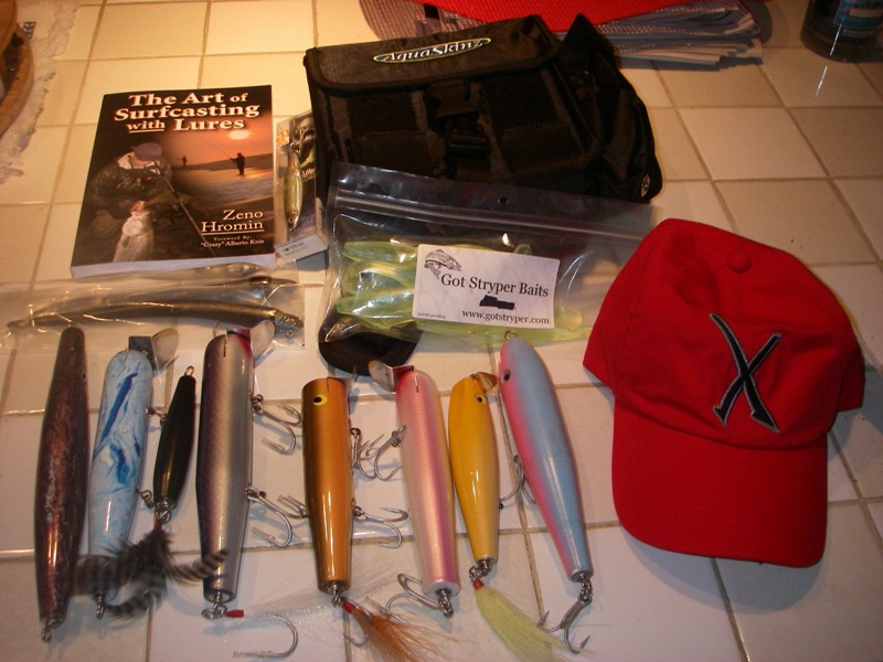 Thanks guys...As of now I have a shimano rod and reel set up, both a tall and small aquaskinz plug bags, plugs from Big fish Co., Afterhours, Salty's, Point jude, Tattoo, Slipknot, Numbskull, Throwing Timber, Cranium, The Dad Fisherman, plus got striper plastics, and Ron Z as well as Zeno's book the art of surf casting with artaficials and much more to come also some other lures. Tickets will be $5 each and 3 for $10. So come by and try your luck at a complete surf package.