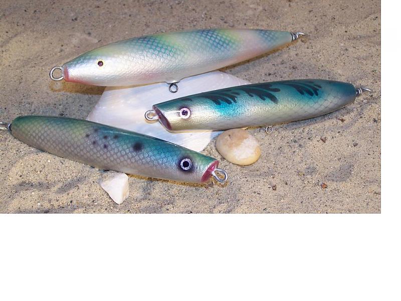 I've been frustrated by previous attempts, found some stencils in my attic the other day, I still have to mess around and maybe tighten them up a little but a big improvement over my other tries, the big spook is a little over 3 oz., the poppers are just over 2 oz. and a present for my dad for his bday, he got a new knee and a triple bypass all in one week last Nov. and hasn't stopped talking about going fishing ever since,