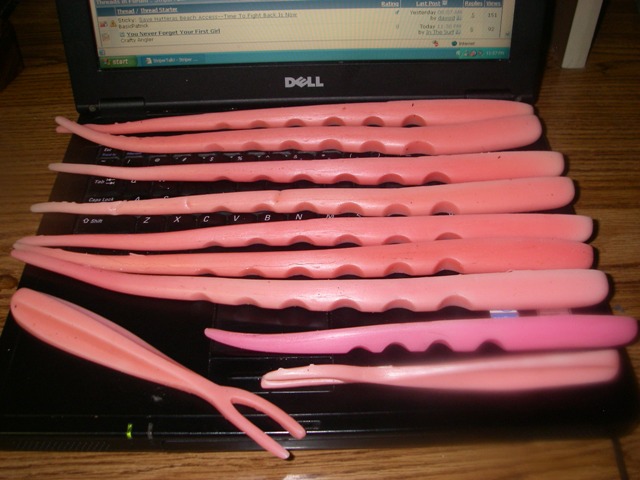 All Pink Lot...Includes seven of his original mega jerks that are over 13", one 9" Jerk and 2 of his split tail minnows....Price is 12.00 plus $3 to mail (reg mail) or you can pay more for faster shipping.
