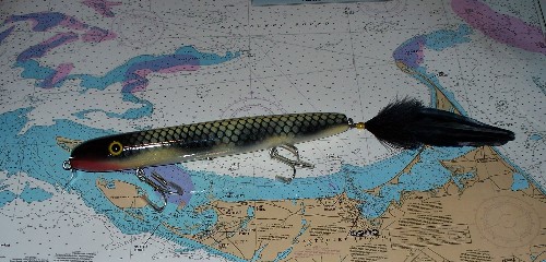 here it is. NO GIGGLING, no OH-MY-GODS, it was 2 x 2 x 10 has 2.6/0 belly hooks an 1. pre-drilled w/eyescrew just incase it's needed. tail hook is 7/0 w/ schlippin feathers, should be good for MONSTER PIKE, if NOT, make for good conversation, or hang