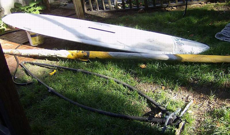 Its been sitting outside since I last used it. I hosed it off but both the board and the sail need a good cleaning and the board needs a new tail fin. I think the one on it cost me like 25$ when I replaced it last time. I unrolled the sail and it seems to be in good shape still.