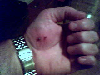 FB... Just in case you decide to do it yourself don't wait,,, It is tough as hell to push a hook through the rest of the way once the swelling starts,,,, It is amazing how tough your skin is,,,, It is even harder to cut a VMC hook with one hand and %$%$%$%$ty pliers,,,