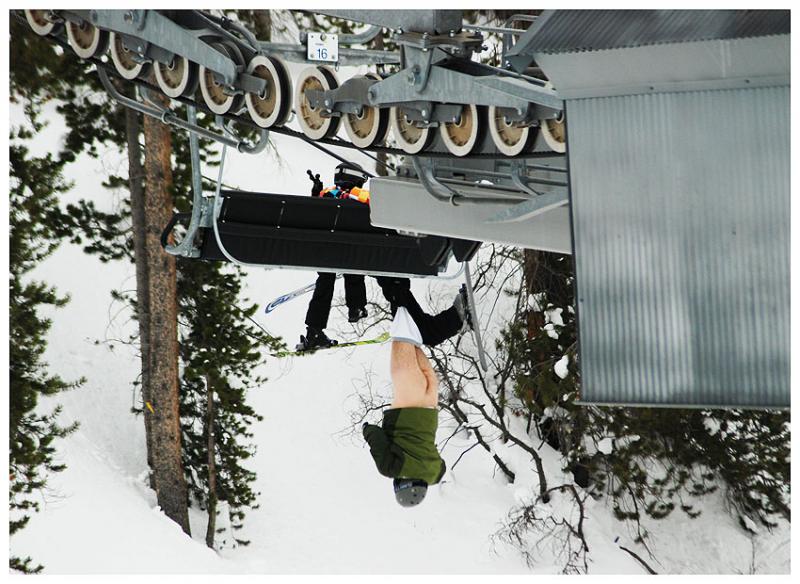 JANUARY 6--In a bizarre incident that will surely lead to litigation (or an out-of-court settlement), a skier at Colorado's ritzy Vail resort was left dangling upside down and pantsless from a chairlift last Thursday morning. The January 1 mishap apparently occurred after the male skier, 48, and a child boarded a high-speed lift in Vail's Blue Sky Basin. It appears that the chairlift's fold-down seat was somehow not in the lowered position, which caused the man to partially fall through the resulting gap. His right ski got jammed in the ascending chairlift, and that kept him upended since his boot never dislodged from its binding. As seen in the photos on the following pages (which were snapped by fellow skiers), the Skyline Express lift was stopped shortly after the pair's botched boarding resulted in the man dangling from the lift. The exposed skier was stuck for about 15 minutes before Vail personnel backed the lift up and successfully dislodged the unidentified man from the four-seat chair. The images on page four and five were taken by Marty Odom (who can be reached at martyodm@gmail.com if you're interested in licensing the photos). In a statement released this afternoon, Vail Resorts, which operates the ski area, reported that the skier was not injured after being "suspended for approximately seven minutes." The press release did not explain how the mishap occurred, only that "the man was caught on the chair."