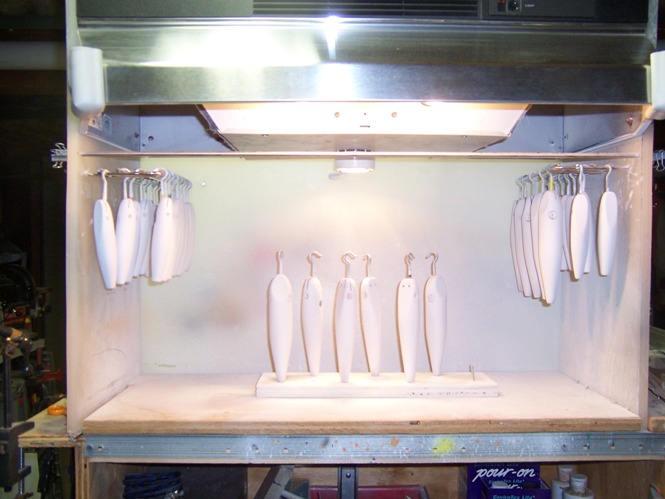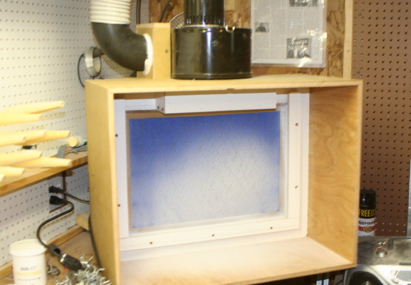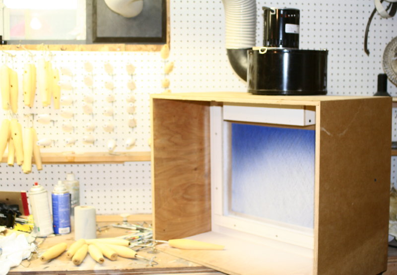 nice mike, where did you get the motor? My problem with those filter in front type booths is they clog fast and then the paint gets on the motor, fan blades and eventually causes it to run out of balance. I sometimes place a piece of cheap paper towel on the filter in front. The air sucks it up against the filter. After it loads up I throw away and do again. Makes the filter last longer. Bernzy told me about this I think. Got to use the cheap towels though so the air can penetrate thru it. Just a thought.