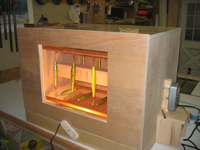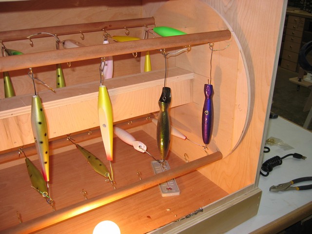 I put it together with all scrap wood, cherry dowels are leftovers(anyone need some for needle blanks?) only money I spent was for the cuphooks, I had the rotissery motor out back in the shed, scrounged up some rod while organizing in the shop, the glass is from an old pink floyd darkside of the moon picture. what can I say, I'm an old yankee.