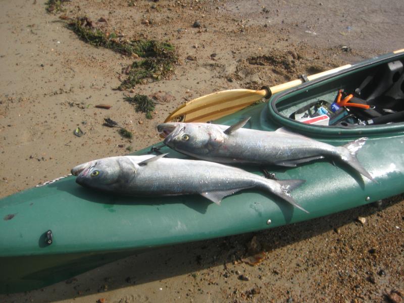 here is a pic of some blues caught trolling last fall up off Manchester(MA) on my kayak bow... I have a rod holder in front and 2 behind my seat... I have been thinking about a SOT for some time and may get a used one this spring