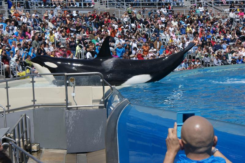 This whale was in a big tank behind the Shamu show. A woman who looked to be a pro photographer put her bag down, and then placed a 3' stuffed killerwhale on top of it. The result was the whale in the tank swimming straight at the window, and then siding up to it, getting eye to eye. It stayed there for a couple of minutes...