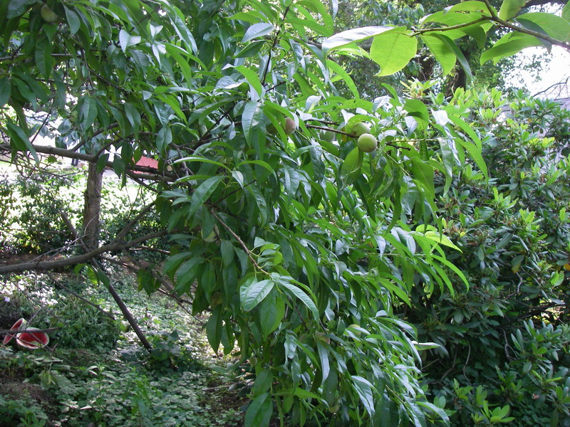 Peach tree is producing nicely. We won't see one piece of fruit though as the tree rats rape it badly. This tree planted itself off of the compost pile.