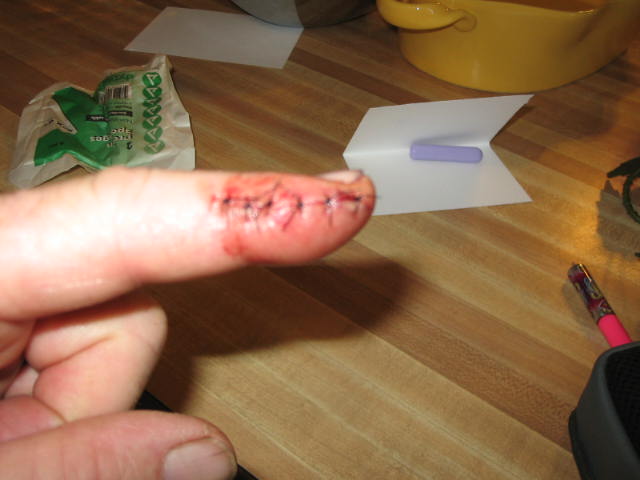 Ever notice that when you do a thing like that you have to pee? And you're short one hand now? Finger looks cool, tell youir pals you were in a sword fight...with a turkey.