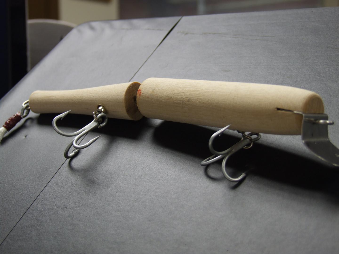 I tried for the inverted "V" on these plugs to facilitate a lot of action on a low speed retrieve. Guys who used to fish the back would tweak their giant pikies this way and would tell me to "Get the body joint out of the water and file the tail section down" so that's what I tried to do with these two prototypes.