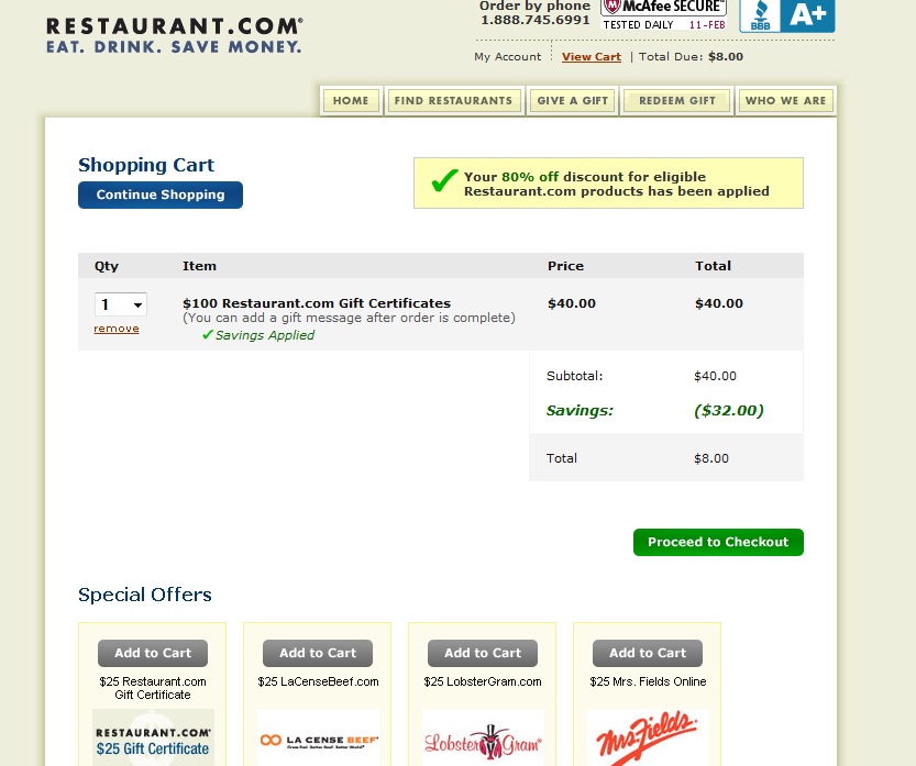 HOLY - I'm going to take this a step further, you can purchase restaurant.com gift cards with the same 80% off " love " code. a $100 dollar gift card is 8 Bucks! ( see screen shot ) not sure if this can be used to purchase the current deals but its still killer! IMO - i might try tomorrow.