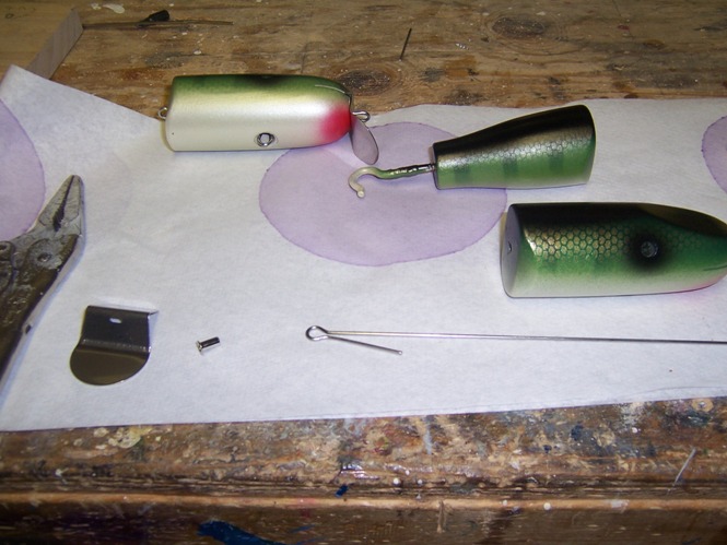 these photos show the assebelly of the plug, for these plug i chose hangers over swivels ( these plugs swam better with the hooks tight to the body .. long story) the holes on the jig are larger going from left to right, and awl makes the perect tool to spread the loop..
