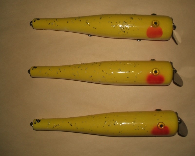 I make the eyes out of acrylic stock to the exact dim. of the originals. I also put a thru hole and a little counter bore in them so I can use a small ss nail to mount them. I like the clear acrylic as I can then paint the bottom of the eyes any color I want and the eye will take on that color. Time consuming but fun. Here are some I did several years ago. I really like making this plug but have not made any in a few years. I really need to make some more as they have all disappeared for some reason.
