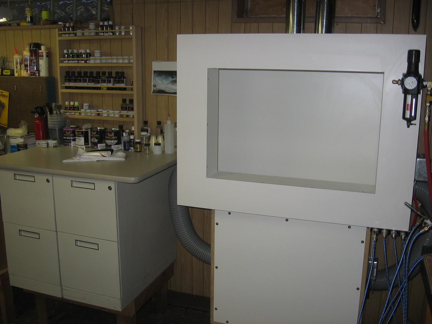 The spray booth is a design I found online by a very talented carver named Ed Waliki. The dimensions of mine are 42"x 32"x20". There is a separate box below that contains a squirrel cage blower motor from an old furnace. This box draws air from the booth through two 4" hoses into the cage then out through two 4" ducts, out a window. There is so much air moving it could not become an explosive situation due to the small volume an airbrush can produce. Most of the time I'll just set the plug on the front edge of the booth and shoot from outside the box. The inside dimension of the opening is 30"x20"x6", this lip helps to keep fumes inside the booth.