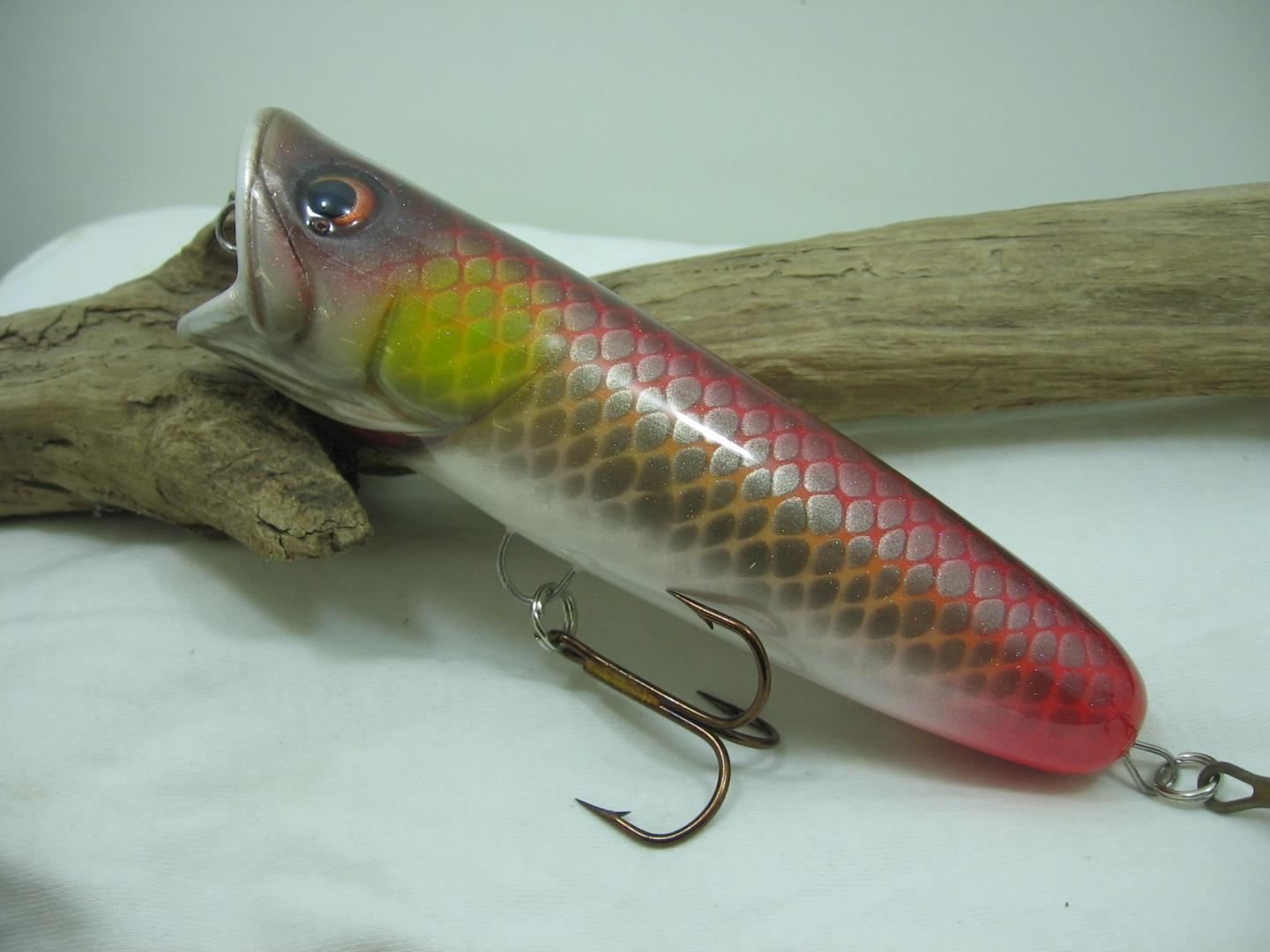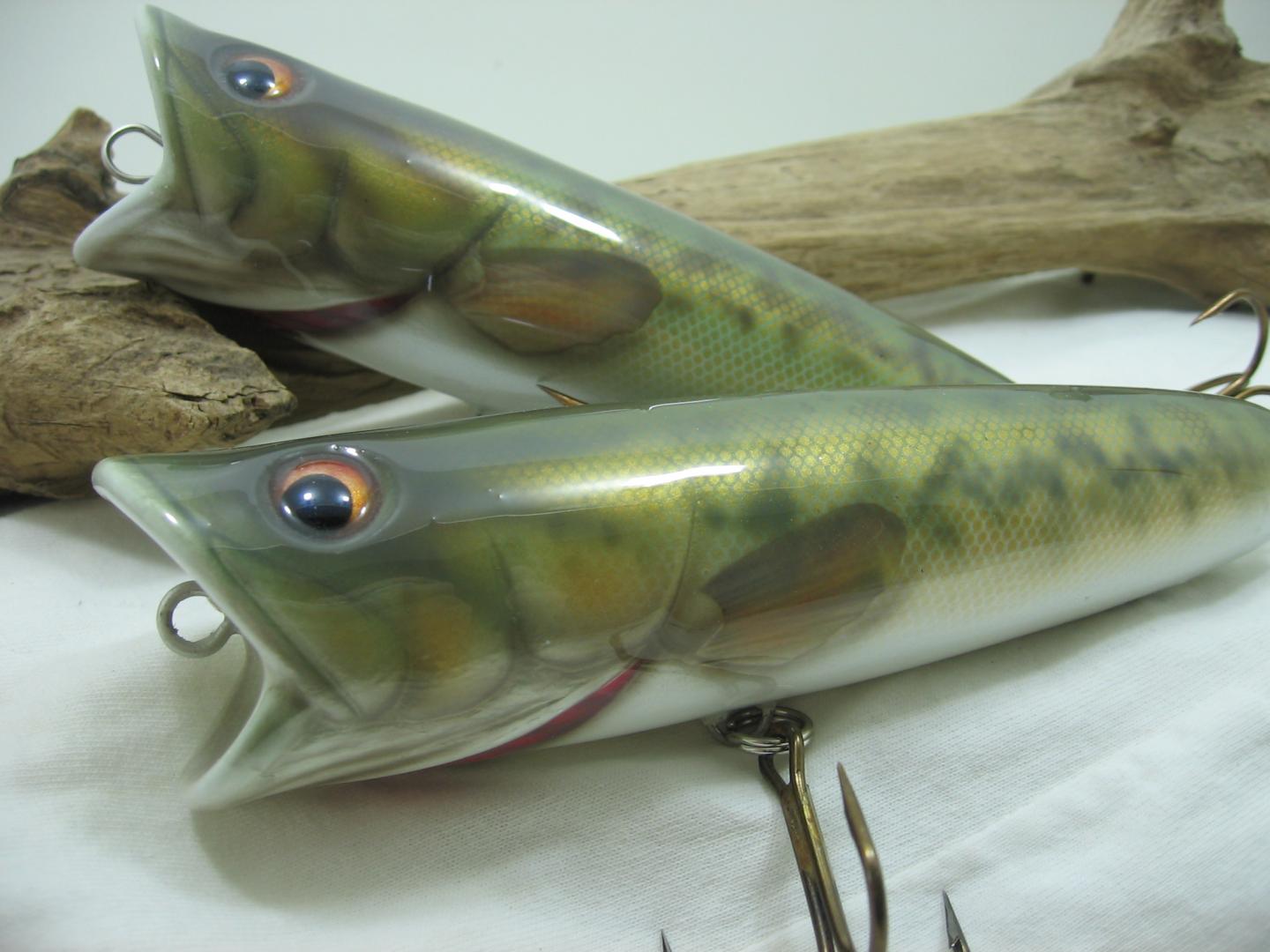 I had a little delay due to an eye shortage. I made some from resin and painted them up the other day, so I was able to finish them up yesterday. Here are the two LMB patterns, and one crazy pattern inspired by the South American Arapaima. These resin poppers are 6.5" and right around 3oz.