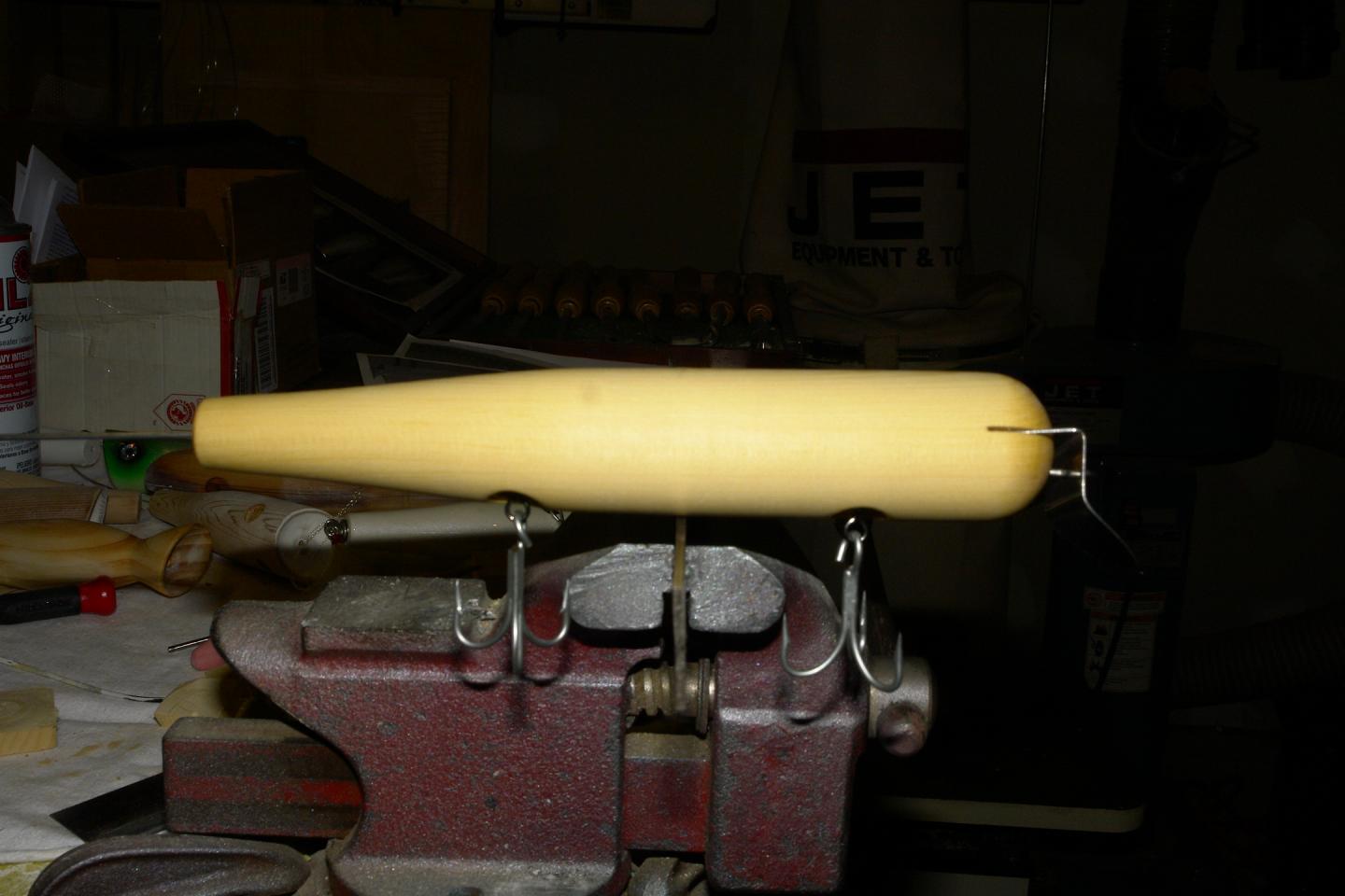 AYC, 7.5", 1.30" dia tapered to .650. Rigged with NJT A40 lip and 3/0 hooks, .250 x 1.00 tail weight. somewhere around 3 oz. balance point is dead center. I'll test like this and see how it does, maybe a little belly weight at the balance point. Also turned a Jr. this morning, white cedar 6" x 1.25" dia. tapered to .680 with single hook and .5 x .25 belly weight just aft of center, I'm going to work w/ a NJT Danny 3 lip and 3/0 hook.